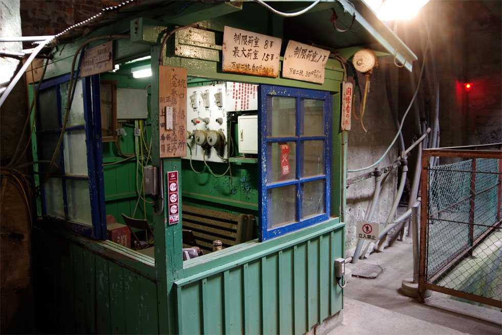 Apart from transports its miners up and down, the No. 2 Shaft played a role in ventilation and drainage. For ventilation, the Pit was in the best airtight structure possible at that time. A revolving door remains by the signals, and the walls and ceiling were covered with brick, concrete and steel sheets. There were eight wooden guide poles reaching from the Vertical Shaft Pit Tower to the bottom of the pit in the old days. The poles served as guide rails and for emergency stops.